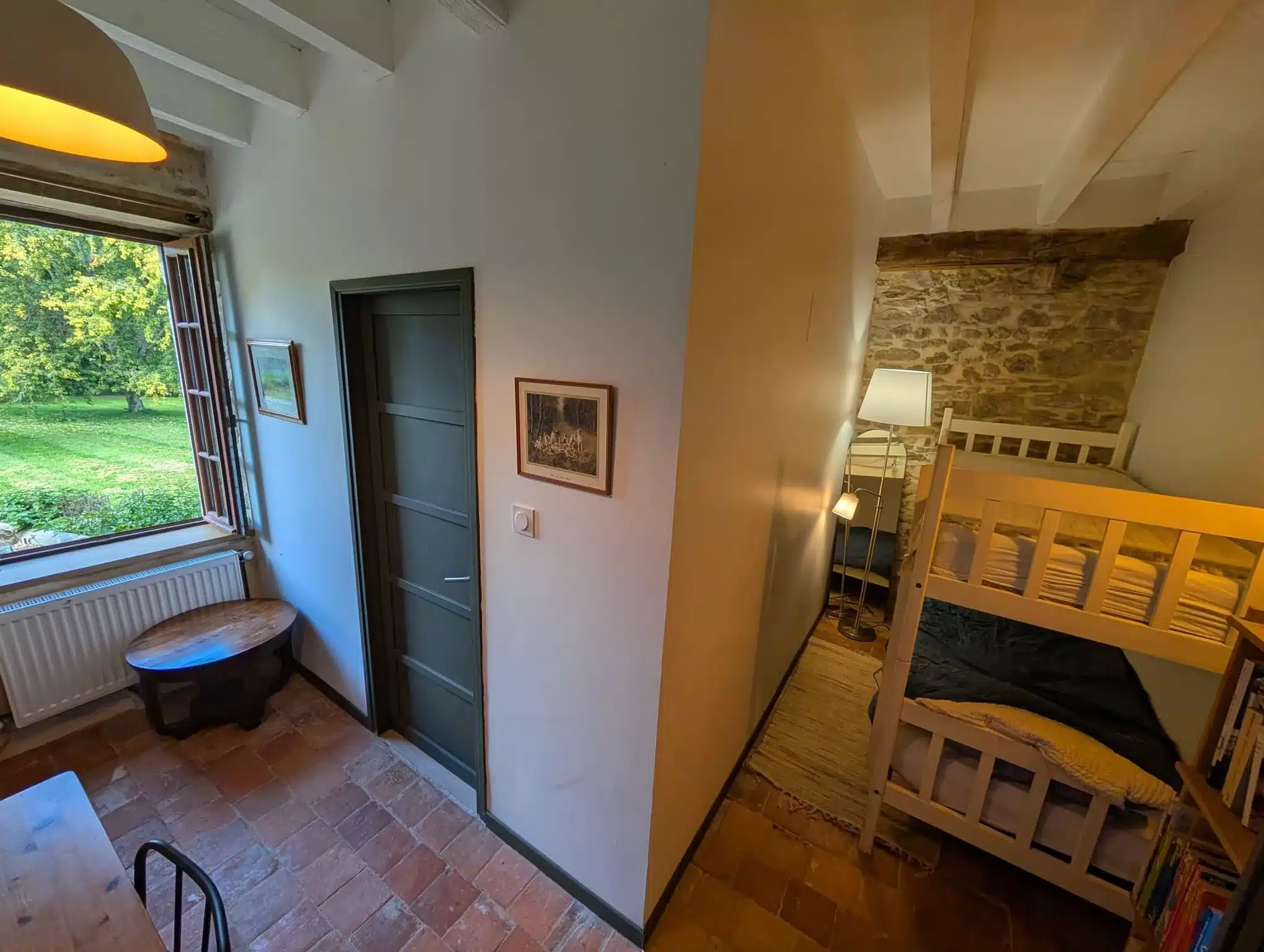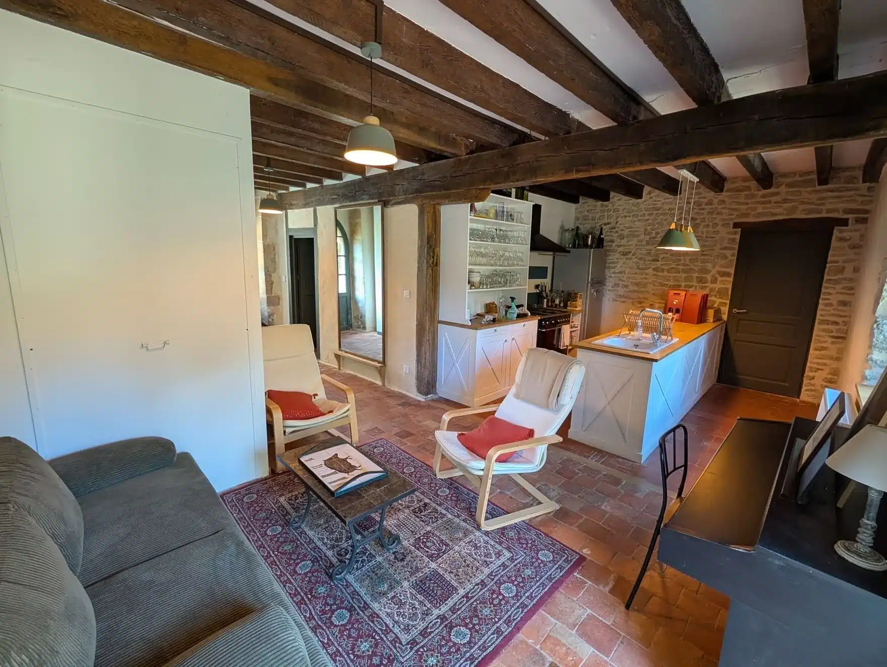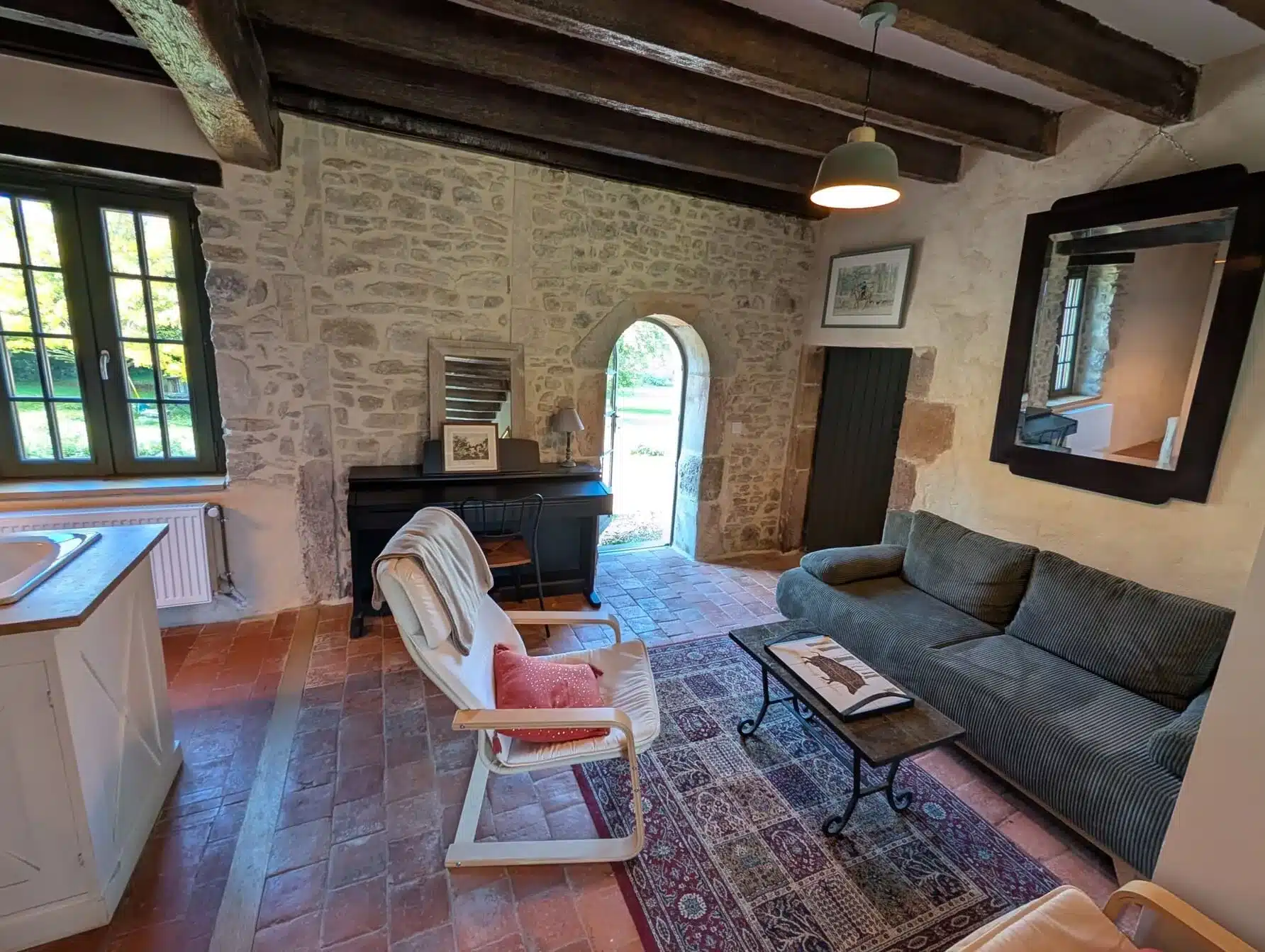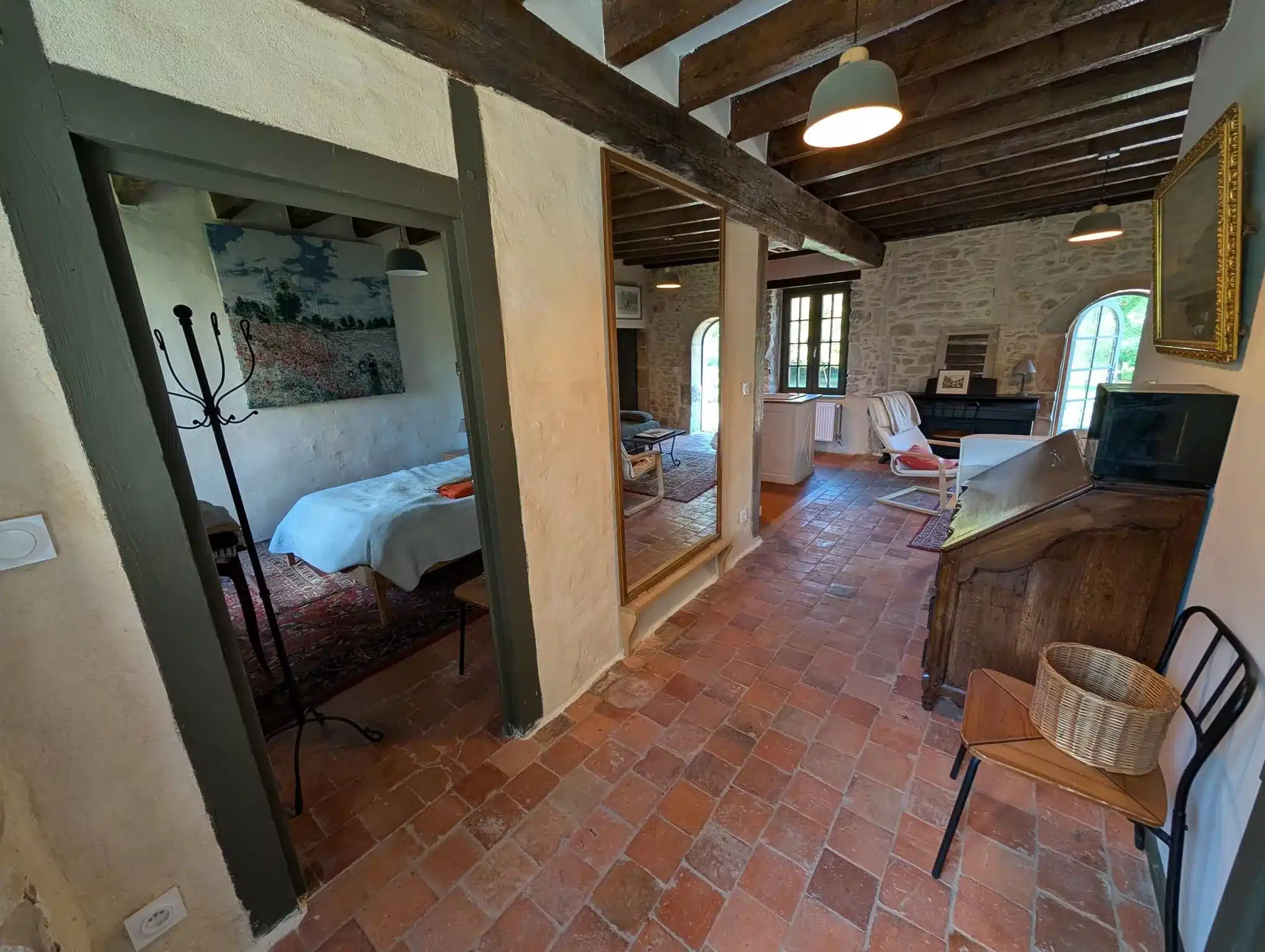 Alliant pierres apparentes et tomettes anciennes, ce studio rénové dans un bâtiment du XIXᵉ siècle jouxtant un manoir du XVIIᵉ offre un cadre unique pour des vacances à deux, au calme et en pleine nature.