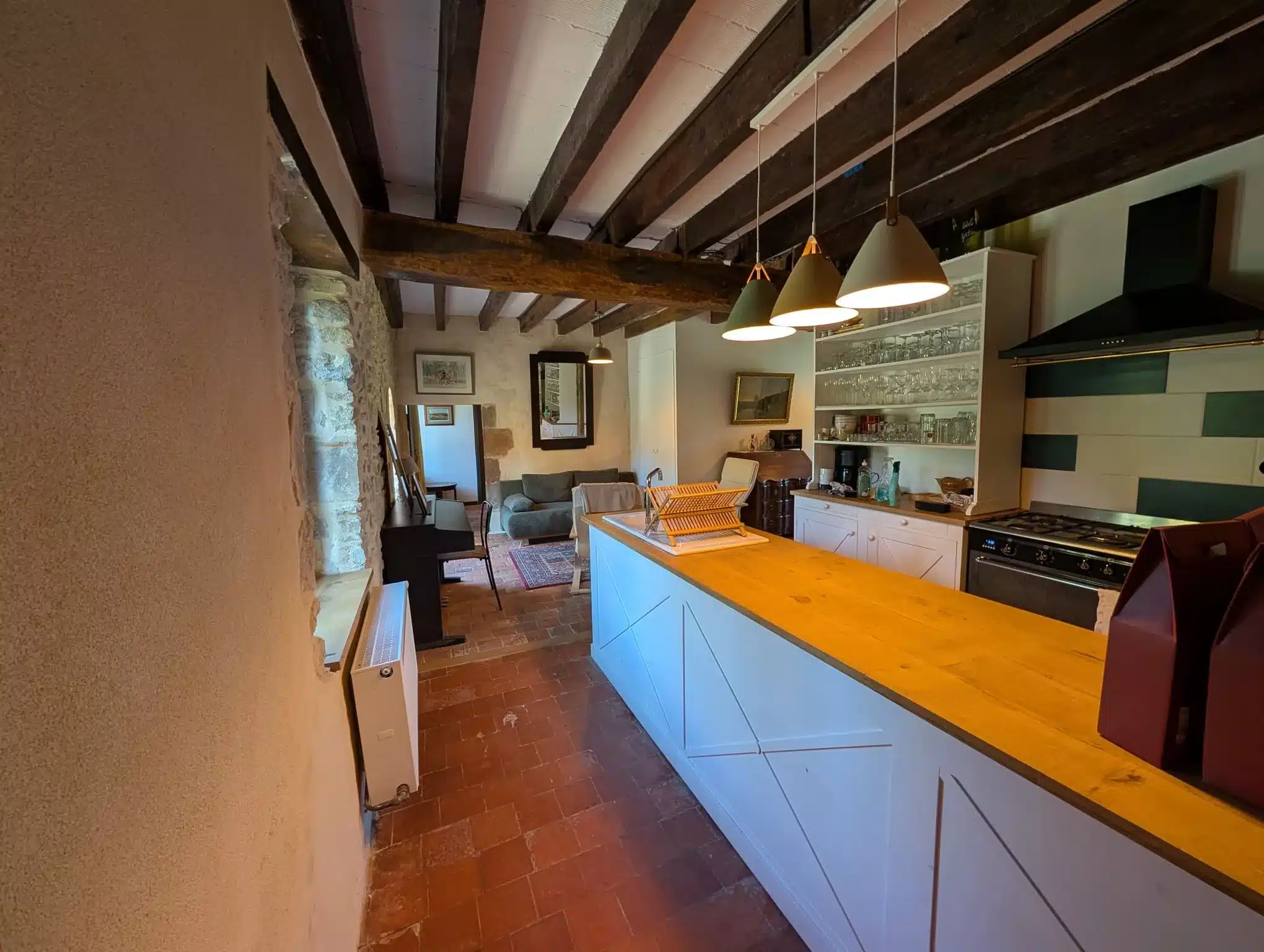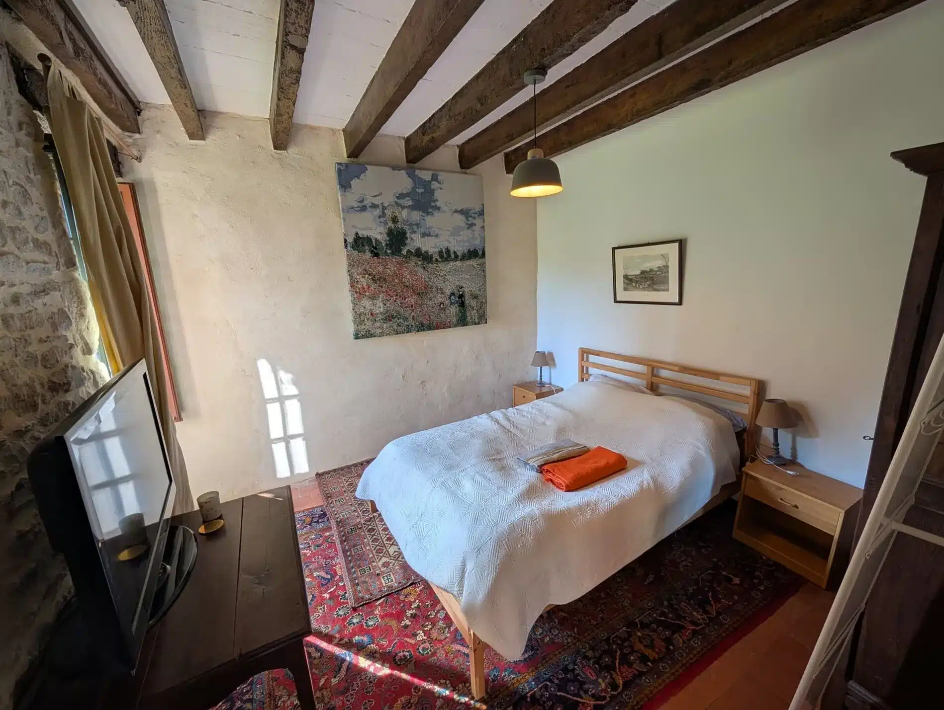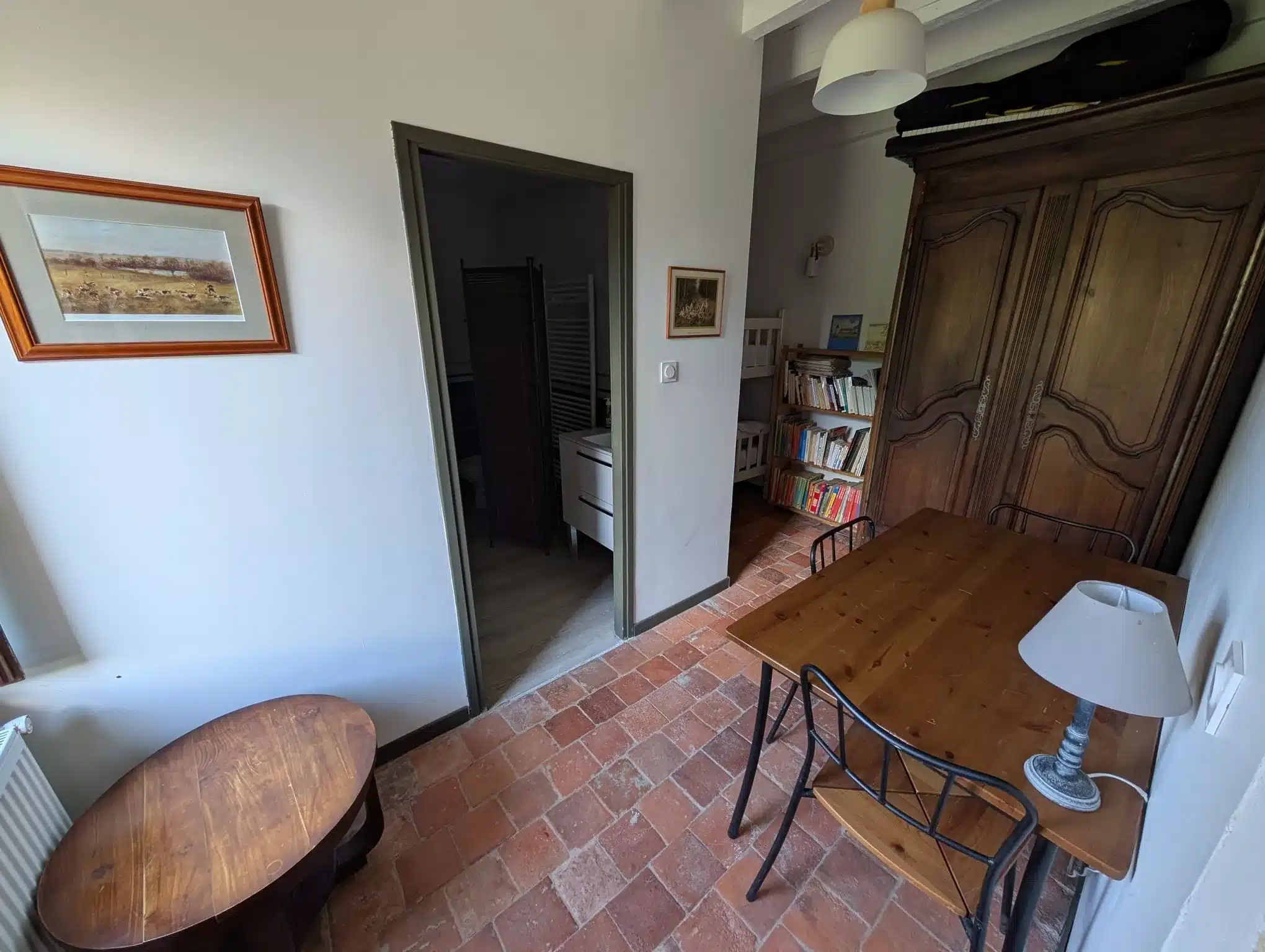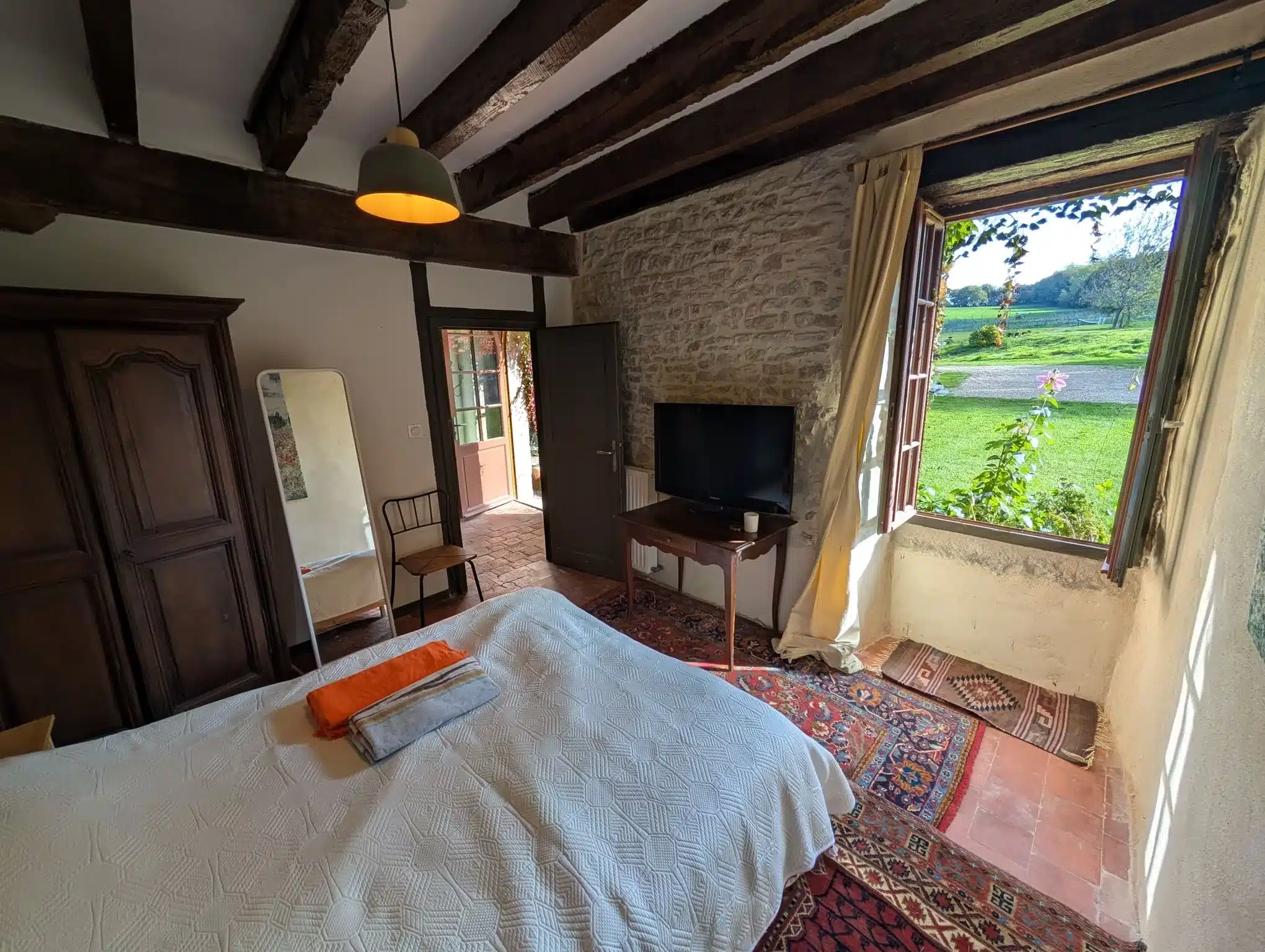 Alliant pierres apparentes et tomettes anciennes, ce studio rénové dans un bâtiment du XIXᵉ siècle jouxtant un manoir du XVIIᵉ offre un cadre unique pour des vacances à deux, au calme et en pleine nature.
